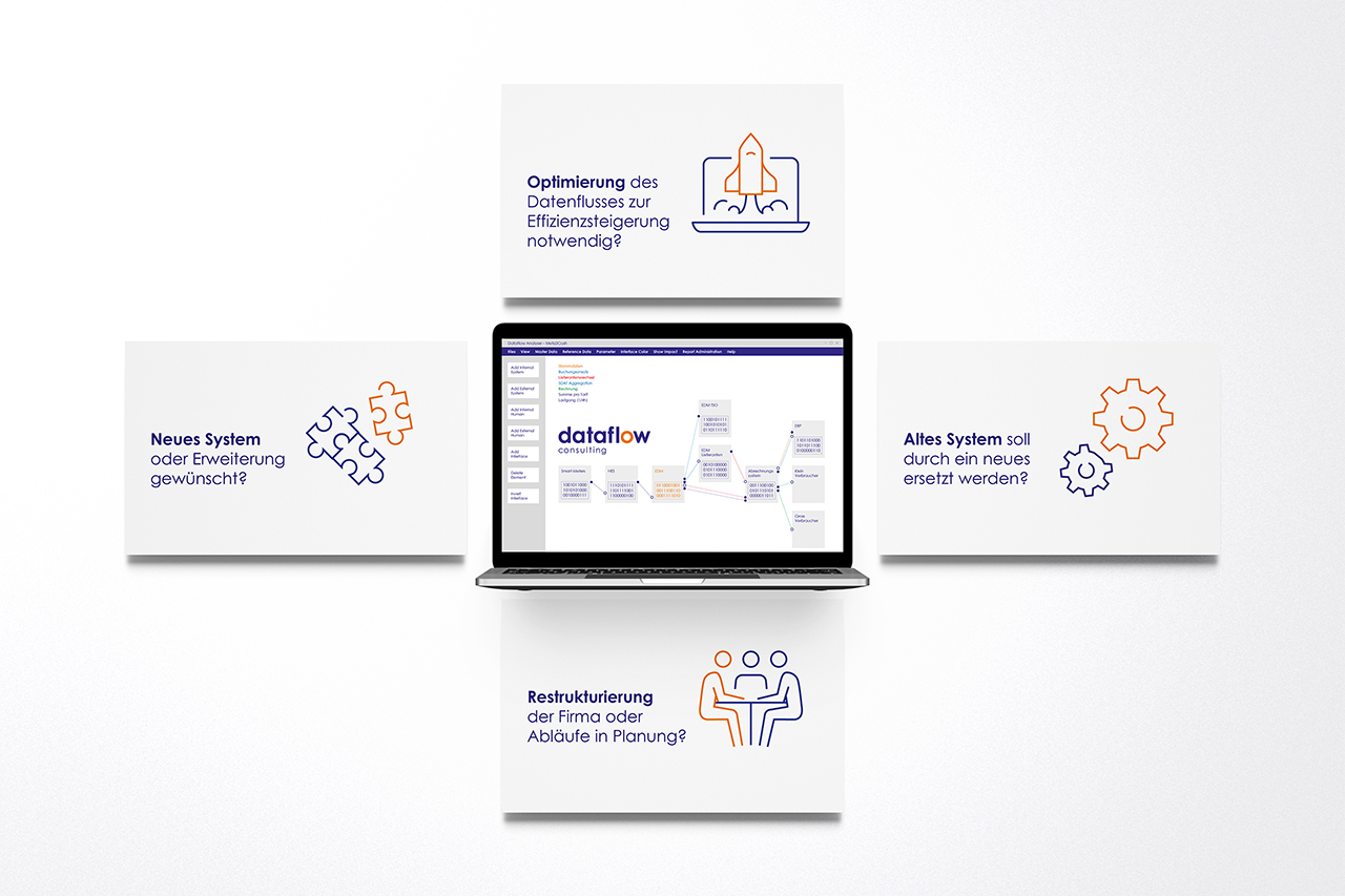 Der DataFlow Analyser ermöglicht, Ihre  Systemlandschaft zu erfassen, neue Systemlandschaften auszudenken und die beste Variante für Sie zu wählen.